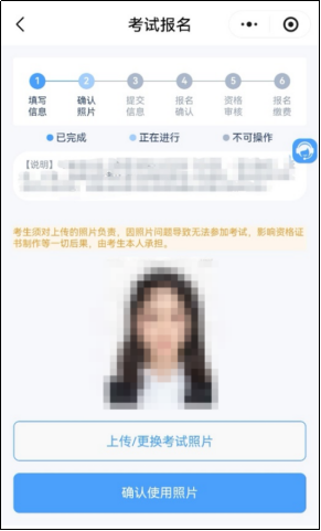 5.報(bào)名信息填寫完成后進(jìn)入“確認(rèn)照片”頁面。如沒有顯示照片或需要更換照片,請點(diǎn)擊“上傳/更換考試照片”,上傳符合要求的照片;如使用顯示的照片,點(diǎn)擊“確認(rèn)使用照片”。