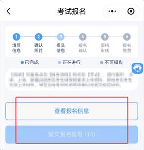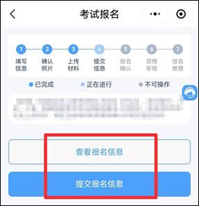 6.確認(rèn)照片后將跳轉(zhuǎn)至【提交信息】頁面,考生可點(diǎn)擊“查看報(bào)名信息”進(jìn)行信息核查。確認(rèn)無誤后,回到報(bào)考流程中的【提交信息】節(jié)點(diǎn),點(diǎn)擊“提交報(bào)名信息”。