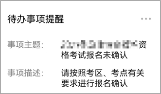 如經(jīng)系統(tǒng)核驗(yàn)考生所提交信息與上一年度不一致,微信公眾號會(huì)發(fā)出報(bào)名未確認(rèn)的“待辦事項(xiàng)提醒”(如下圖)。