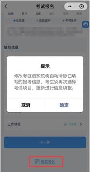 3.如信息填寫后發(fā)現(xiàn)省份選擇有誤,請?jiān)凇拔刺峤粓?bào)名信息”狀態(tài)下,使用【修改考區(qū)】功能進(jìn)行修改。修改考區(qū)操作將會(huì)清空此項(xiàng)目下已經(jīng)填寫的報(bào)名信息,但不影響注冊信息和基本信息。