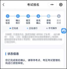 分為考點(diǎn)審核和考區(qū)審核兩個(gè)階段,考生可在【報(bào)考流程】中查看資格審核狀態(tài),考區(qū)審核通過后,【資格審核】節(jié)點(diǎn)變?yōu)樯钏{(lán)色。