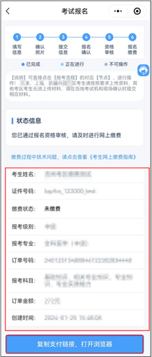 如所在考區(qū)尚未開通手機(jī)繳費(fèi)通道,系統(tǒng)會(huì)提示考生使用電腦端登錄考生管理平臺完成網(wǎng)上繳費(fèi)。