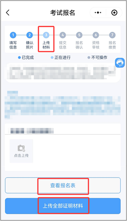 填寫信息完成后,系統(tǒng)將跳轉(zhuǎn)至【上傳材料】節(jié)點(diǎn),進(jìn)入上傳材料頁面??忌上赛c(diǎn)擊“查看報(bào)名表”,下載并打印報(bào)名申請表,然后按照考區(qū)的要求上傳相關(guān)證明材料。