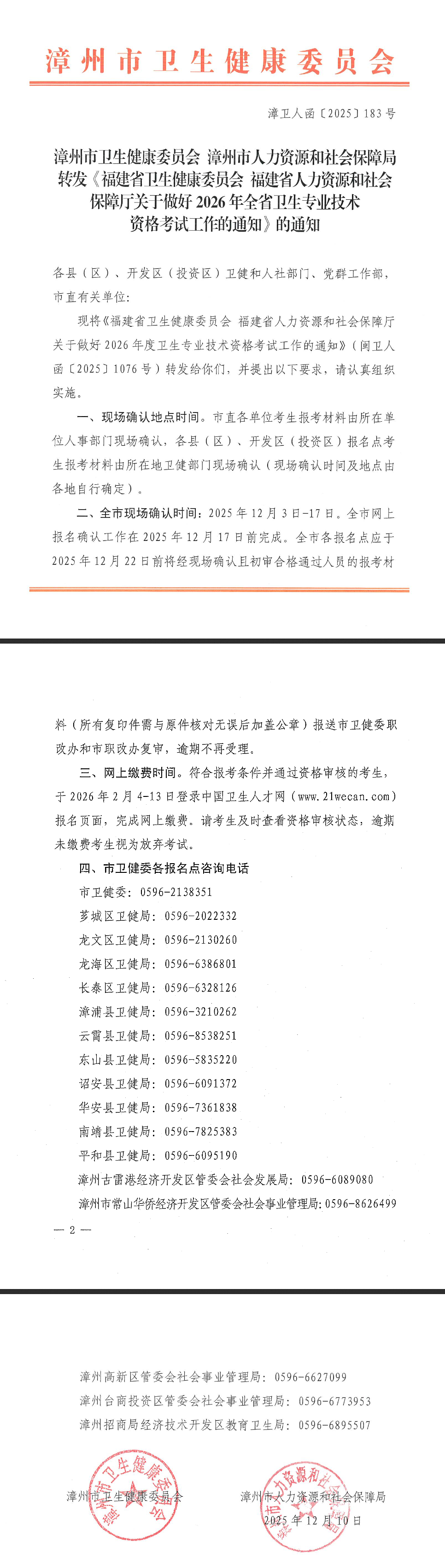 漳州市關(guān)于做好2026年衛(wèi)生專業(yè)技術(shù)資格考試工作的通知