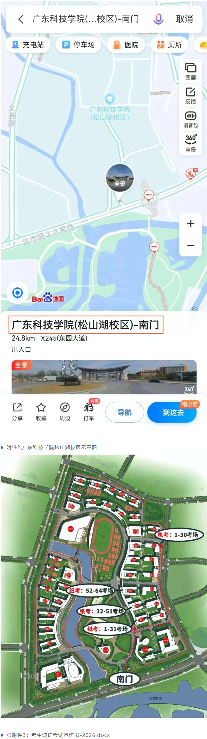 考生要預留充足的出行時間或在考試前一天到考場踩點,熟悉考場地理位置,以確??荚嚠斕炷茼樌竭_考場。特別是廣東科技學院松山湖校區(qū)位置較為偏遠,提醒考生踩點統(tǒng)一從廣東科技學院松山湖校區(qū)南門進入。考生盡量選擇“拼車”或乘坐公共交通的方式前往考場。