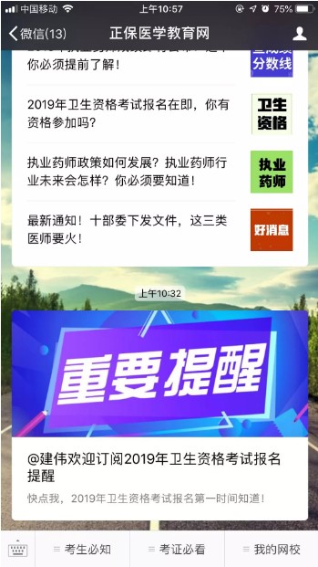 相信很多參加2019年衛(wèi)生資格考試的朋友對于報名時間非常的感興趣,為方便考生快速獲取報名通知,現(xiàn)在可以訂閱醫(yī)學教育網(wǎng)微信提醒,一鍵訂閱,自動提醒,不用您在電腦前苦苦刷新中國衛(wèi)生人才網(wǎng)了,只要訂閱,報名入口開通時,微信自動收到報名提醒,下面來看看如何微信訂閱2019年衛(wèi)生資格考試報名時間吧。