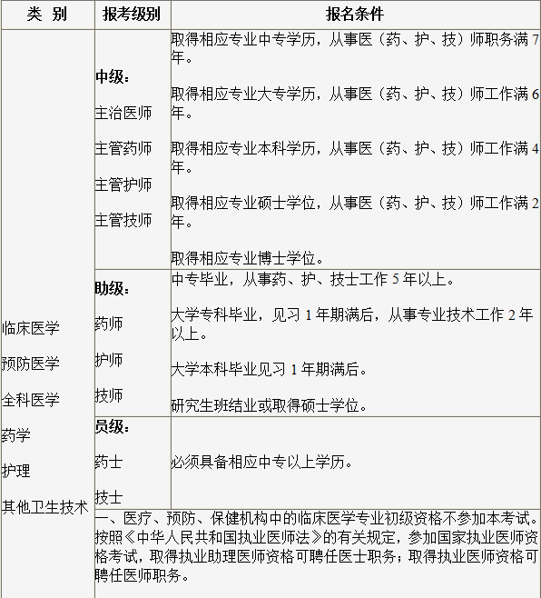 凡遵紀守法,恪守職業(yè)道德,身體健康能夠適應考試且符合原衛(wèi)生部、人事部印發(fā)的《臨床醫(yī)學專業(yè)技術資格考試暫行規(guī)定》(衛(wèi)人發(fā)〔2000〕462號)和《預防醫(yī)學、全科醫(yī)學、藥學、護理、其他衛(wèi)生技術等專業(yè)技術資格考試暫行規(guī)定》(衛(wèi)人發(fā)〔2001〕164號)中報名條件的人員,均可報名參加相應級別和專業(yè)類別的考試,具體報名條件如下: