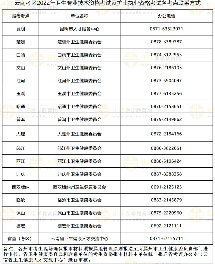 云南考區(qū)2022年衛(wèi)生專業(yè)技術(shù)資格考試各考點聯(lián)系方式