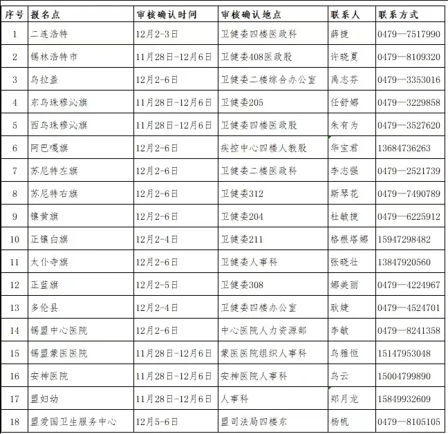 錫盟中心醫(yī)院、錫盟蒙醫(yī)醫(yī)院、錫林郭勒盟婦幼保健院和錫林郭勒盟安神醫(yī)院在本單位初審。其他盟直屬各醫(yī)療單位、錫林郭勒職業(yè)學(xué)院醫(yī)學(xué)院和錫林郭勒盟檢驗檢測中心到盟愛國衛(wèi)生服務(wù)中心進行初審。