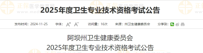 阿壩州2025年度衛(wèi)生專業(yè)技術(shù)資格考試公告