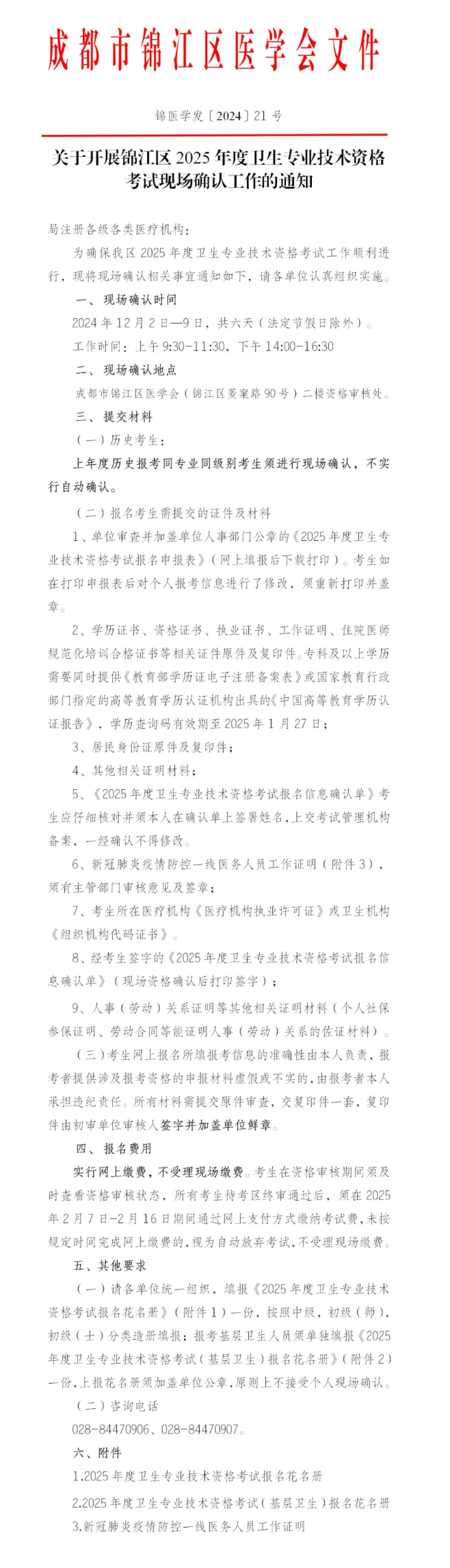 成都錦江區(qū)2025年衛(wèi)生專業(yè)技術(shù)資格考試現(xiàn)場(chǎng)確認(rèn)工作的通知