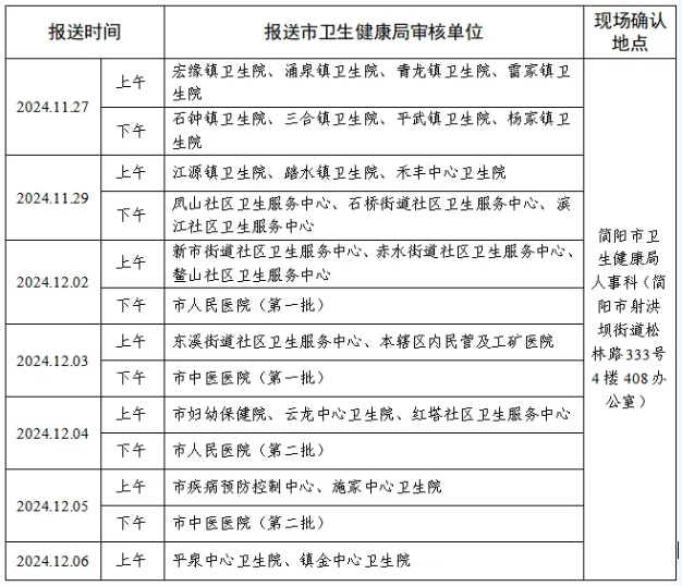 現(xiàn)場審核地址:簡陽市衛(wèi)健局人事科(簡陽市射洪壩街道松林路333號4樓408辦公室),咨詢電話:27028277