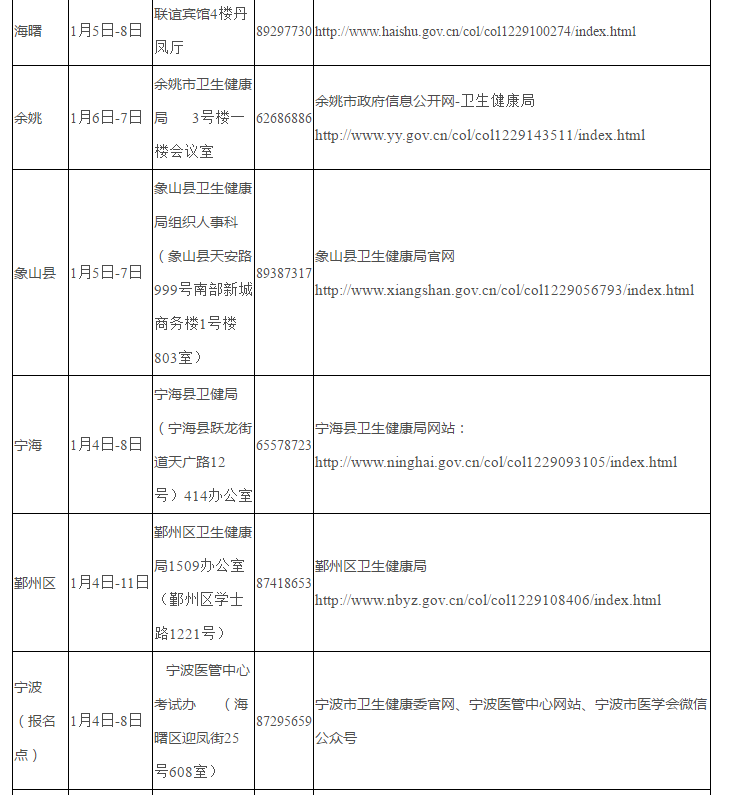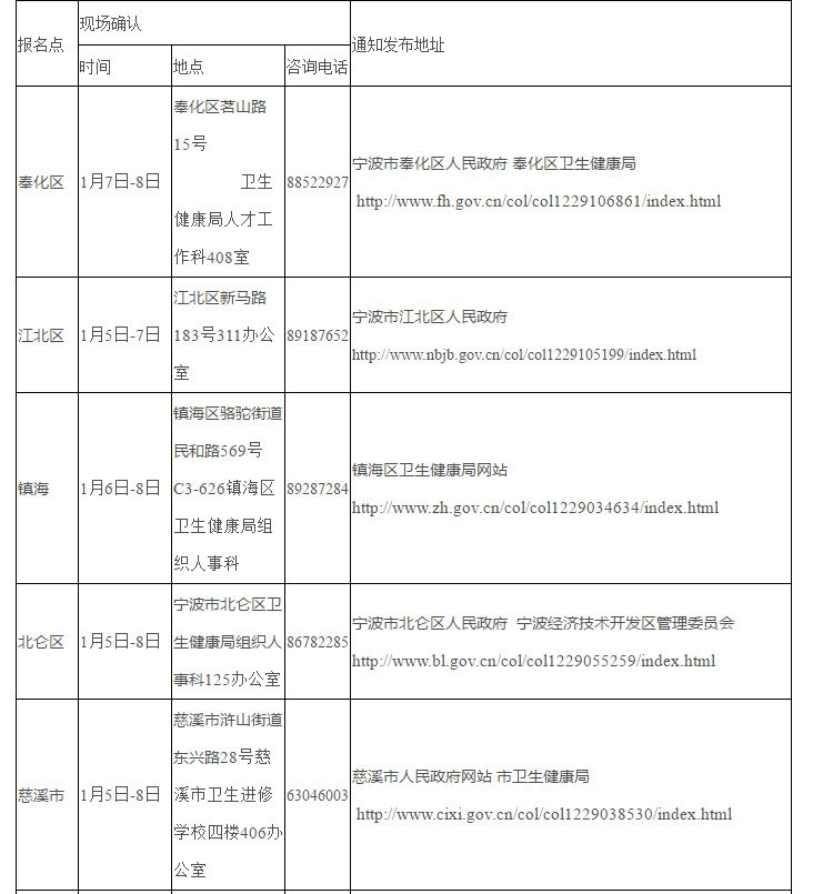 (二)寧波市衛(wèi)生專業(yè)技術(shù)資格考試實行屬地化管理。市屬醫(yī)療衛(wèi)生單位報考人員到本單位報名確認;未設報名點市屬醫(yī)療衛(wèi)生單位報考人員到寧波市醫(yī)學學術(shù)交流管理中心(寧波市海曙區(qū)迎鳳街25號6樓608考試辦公室 電話87295659)進行確認;縣(市)區(qū)醫(yī)療衛(wèi)生單位和縣(市)區(qū)其他企事業(yè)單位報考人員到單位所在地的縣(市)區(qū)衛(wèi)健局報名確認,具體確認時間見附表。