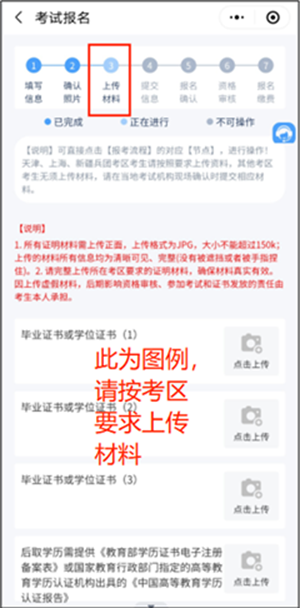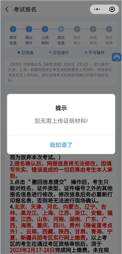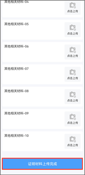 6.采用線上確認的考區(qū),系統(tǒng)將跳轉至【上傳材料】頁,也可點擊報考流程中的【上傳材料】節(jié)點,進入上傳材料頁面,請考生按照考區(qū)的要求上傳相關證明材料,材料上傳完成后,點擊“證明材料上傳完成”,考生可再次查看報名信息,確認無誤后,點擊“提交報名信息”。