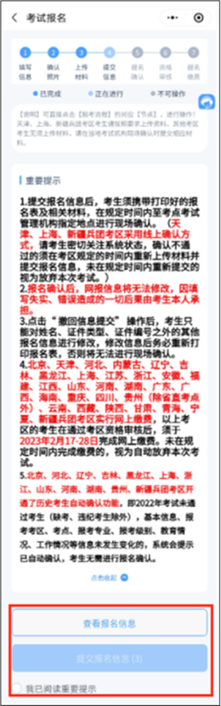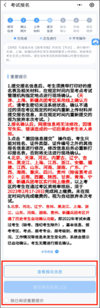提交報名信息后,考生須在當?shù)乜荚嚬芾頇C構規(guī)定時間內,按照規(guī)定的方式進行報名確認。采用現(xiàn)場確認方式的考區(qū),考生須攜帶報名表和相關材料前往指定地點進行報名確認;采用線上確認方式的考區(qū),考生在報名系統(tǒng)中提交報名信息后,等待系統(tǒng)反饋報名確認結果,如提示“確認不通過”,考生須在所在考區(qū)規(guī)定的截止日期前重新上傳報名材料,逾期未重新上傳并提交報名信息的,視為自動放棄本次考試。