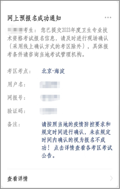 考生提交報名信息后,將收到中國衛(wèi)生人才網(wǎng)微信公眾號發(fā)送的微信提醒(見下圖),請考生按照考區(qū)相關要求及時進行報名確認。逾期未進行確認的,視為自動放棄考試。