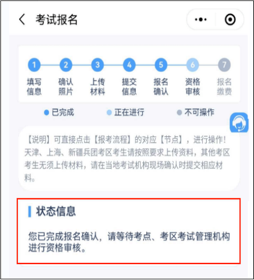 經(jīng)報名點或考點確認后,【報名確認】節(jié)點變?yōu)樯钏{色,同時【資格審核】節(jié)點變?yōu)闇\藍色。