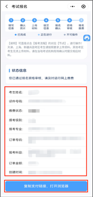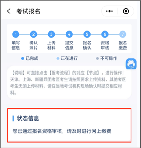 未開通網(wǎng)上繳費的考區(qū),【資格審核】節(jié)點變?yōu)樯钏{色即表示報名成功。
