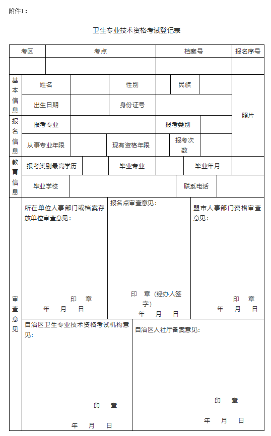 3、衛(wèi)生專業(yè)技術(shù)資格考試登記表;(加蓋所在單位人事部門印章)(見附件1)