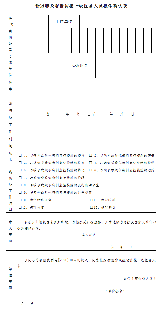 3、《新冠肺炎疫情防控一線醫(yī)務人員報考確認表》