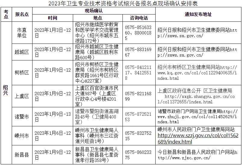 (一)全市衛(wèi)生專業(yè)技術(shù)資格考試實(shí)行屬地化管理,設(shè)7個(gè)報(bào)名點(diǎn)(見(jiàn)附件)。市直各醫(yī)療衛(wèi)生健康單位由所在單位集中后到紹興市繼續(xù)醫(yī)學(xué)教育和醫(yī)學(xué)學(xué)術(shù)交流管理中心(紹興市城東五泄路172號(hào))確認(rèn)報(bào)名,各區(qū)、縣(市)考生由所在單位集中后到各區(qū)、縣(市)衛(wèi)健局確認(rèn)報(bào)名。