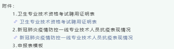 8.一線人員報(bào)名還需提交《新冠肺炎疫情防控一線專業(yè)技術(shù)人員抗疫表現(xiàn)情況》(模板見附件4)一式三份,以及本人所在工作單位出具的正式文件。(文件須注明符合哪個文件的一線人員規(guī)定、享受什么政策傾斜、公示方式、公示結(jié)果和單位意見。同一單位有多名人員的,所在單位出具一份文件后附名單和公示材料)