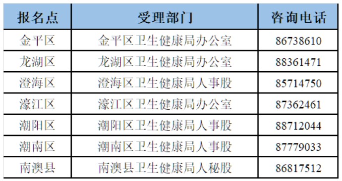 市直各單位考生報(bào)名由所在單位報(bào)名點(diǎn)及市直報(bào)名點(diǎn)受理,汕大醫(yī)學(xué)院各附屬醫(yī)院由各醫(yī)院報(bào)名點(diǎn)受理,其他各區(qū)(縣)內(nèi)醫(yī)療衛(wèi)生單位,均由所在區(qū)(縣)報(bào)名點(diǎn)受理。