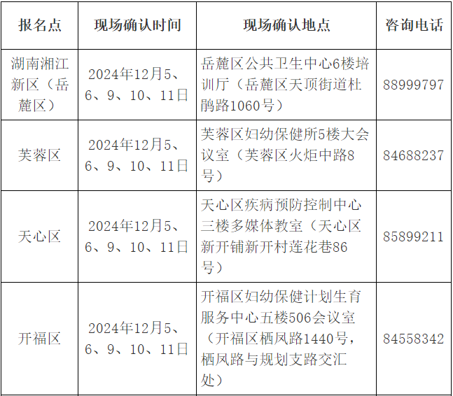 長(zhǎng)沙考點(diǎn)提供咨詢服務(wù),不進(jìn)行現(xiàn)場(chǎng)確認(rèn)。地址:長(zhǎng)沙市計(jì)劃生育科技服務(wù)中心(芙蓉區(qū)火星街道紫薇路89號(hào),國策大廈7樓),咨詢電話:0731-84713522。