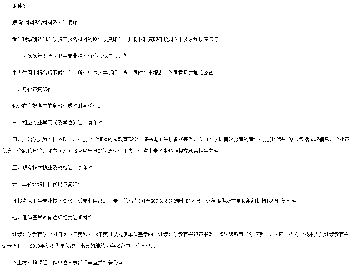 ①工作單位人事部門審查并加蓋單位人事部門公章的《2020年度衛(wèi)生專業(yè)技術資格考試申請表》(從網(wǎng)上填報后下載打?。?。如考生在打印申請表后對個人報考信息進行了修改,考生須重新打印申請表并蓋章。