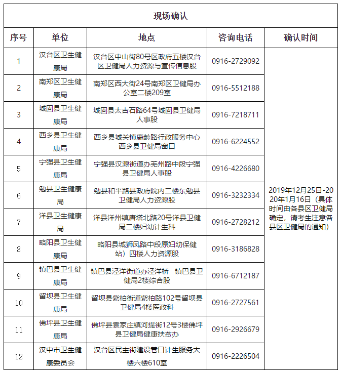 (3)漢臺區(qū)轄區(qū)內(nèi)除市中心醫(yī)院、三二0一醫(yī)院、市鐵路中心醫(yī)院、漢中療養(yǎng)院、市疾控中心、漢中職業(yè)技術(shù)學(xué)院附屬醫(yī)院、西安醫(yī)學(xué)院附屬漢江醫(yī)院、市中心血站、市婦幼保健所、市復(fù)退軍人精神病康復(fù)醫(yī)院、市福利院附屬民康醫(yī)院的其他所有公立醫(yī)療衛(wèi)生單位和考生檔案在市、區(qū)人才交流中心管理的非公立醫(yī)療衛(wèi)生單位均由單位人事部門統(tǒng)一到漢臺區(qū)衛(wèi)健局報名點進行現(xiàn)場確認。