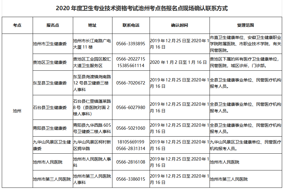附件7:2020年度衛(wèi)生專業(yè)技術(shù)資格考試池州考點各報名點現(xiàn)場確認聯(lián)系方式定稿
