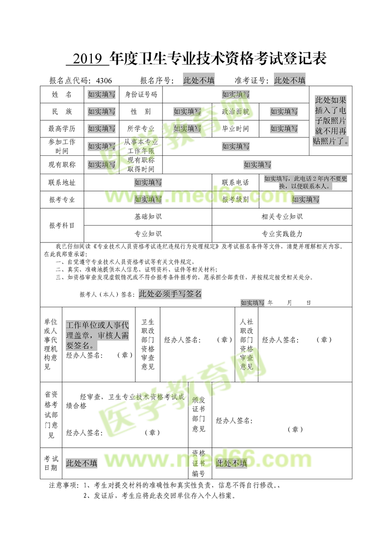 2019年度衛(wèi)生專業(yè)技術資格考試登記表,衛(wèi)生資格考試所需2019年度衛(wèi)生專業(yè)技術資格考試登記表,醫(yī)學教育網搜集到此登記表,具體如下: