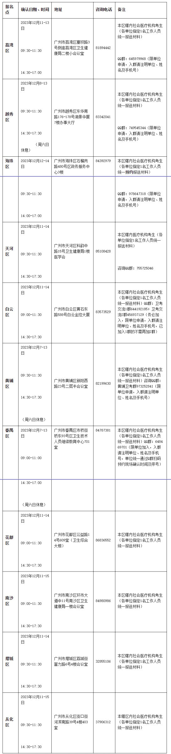 (2)各區(qū)衛(wèi)健局分別設(shè)立報(bào)名點(diǎn),受理本區(qū)衛(wèi)健局直屬單位(或區(qū)直屬單位)及轄區(qū)內(nèi)社會(huì)醫(yī)療機(jī)構(gòu)的報(bào)名確認(rèn),受理本區(qū)衛(wèi)健局直屬單位(或區(qū)直屬單位)的確認(rèn)時(shí)間和地點(diǎn)由各區(qū)根據(jù)實(shí)際情況自行確定,于2023年12月10日前完成現(xiàn)場確認(rèn)工作;受理社會(huì)醫(yī)療機(jī)構(gòu)的報(bào)名確認(rèn)時(shí)間及地點(diǎn),具體安排如下: