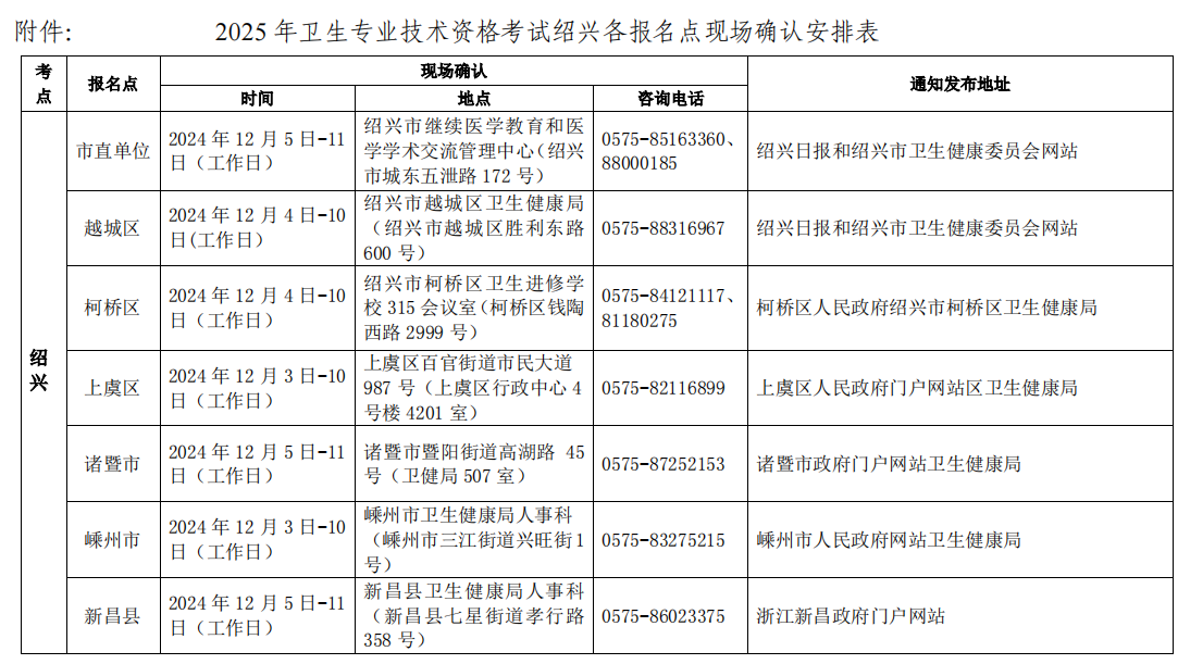 考試報(bào)名、繳費(fèi)、準(zhǔn)考證打印、成績(jī)查詢等相關(guān)信息,考生可關(guān)注“浙醫(yī)聘”微信公眾號(hào),實(shí)時(shí)了解相關(guān)工作動(dòng)態(tài)。附件 2025 年衛(wèi)生專業(yè)技術(shù)資格考試紹興各報(bào)名點(diǎn)現(xiàn)場(chǎng)確認(rèn)安排表