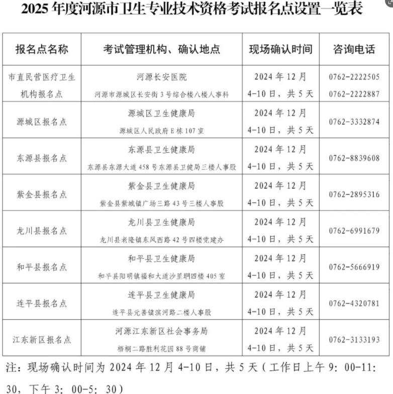 4.各縣區(qū)報名點(diǎn)現(xiàn)場確認(rèn)的時間和地點(diǎn)詳見《2025年河源市衛(wèi)生專業(yè)技術(shù)資格考試報名點(diǎn)設(shè)置一覽表》。