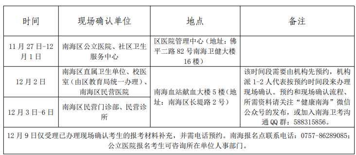 (一)《報(bào)名申請(qǐng)表》(國(guó)網(wǎng)生成)和《報(bào)名審核表》(省網(wǎng)生成)原件,《報(bào)名申請(qǐng)表》和《報(bào)名審核表》各欄目?jī)?nèi)容須與提交的證時(shí)間 現(xiàn)場(chǎng)確認(rèn)單位 地點(diǎn)備注11月27日-12月1日南海區(qū)公立醫(yī)院、社區(qū)衛(wèi)生服務(wù)中心區(qū)醫(yī)院管理中心(地址:佛平二路82號(hào)南海衛(wèi)健大樓16樓,12月2日南海區(qū)直屬衛(wèi)生單位、校醫(yī)室(由區(qū)教育局統(tǒng)一辦理)、南海區(qū)民營(yíng)醫(yī)院 南海血站獻(xiàn)血大樓5樓(地址:南海區(qū)長(zhǎng)堤路2號(hào))該時(shí)間段需要由機(jī)構(gòu)先預(yù)約,機(jī)構(gòu)派1-2 人代表按預(yù)約時(shí)間段來(lái)辦理現(xiàn)場(chǎng)確認(rèn)。預(yù)約和現(xiàn)場(chǎng)確認(rèn)流程、所需資料請(qǐng)關(guān)注“健康南?!蔽⑿殴娞?hào)的發(fā)布,或加入南海衛(wèi)考溝通QQ 群:588315856。12月3日-6日南海區(qū)民營(yíng)門(mén)診部、民營(yíng)診所,12月9日僅受理已辦理現(xiàn)場(chǎng)確認(rèn)考生的報(bào)考材料補(bǔ)充,并需電話(huà)預(yù)約。南海報(bào)名點(diǎn)聯(lián)系電話(huà)0757-86289085;公立醫(yī)院報(bào)名考生可咨詢(xún)所在單位人事部門(mén)。