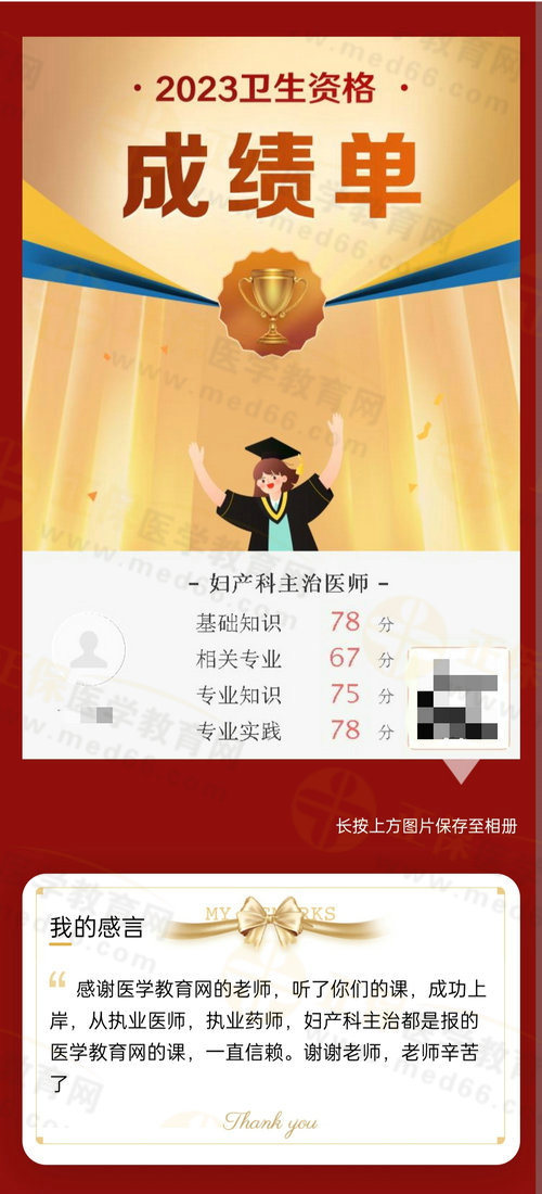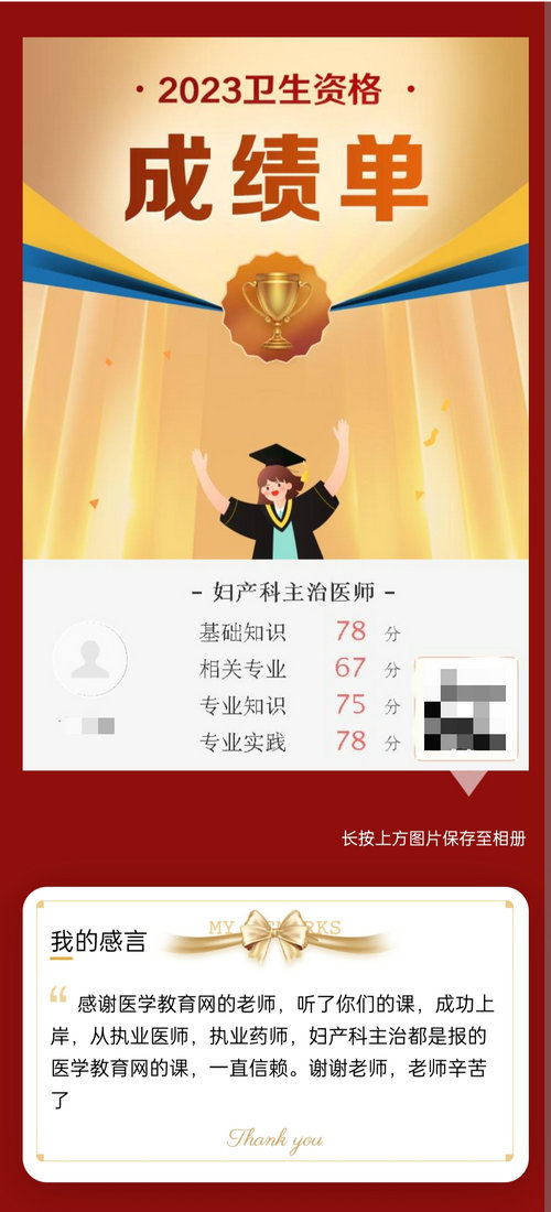 感謝醫(yī)學(xué)教育網(wǎng)的老師們,聽了你們的課,成功上岸,從執(zhí)業(yè)醫(yī)師,執(zhí)業(yè)藥師,婦產(chǎn)科主治都是報(bào)的醫(yī)學(xué)教育網(wǎng)的課,一直信賴。謝謝老師,老師辛苦了。