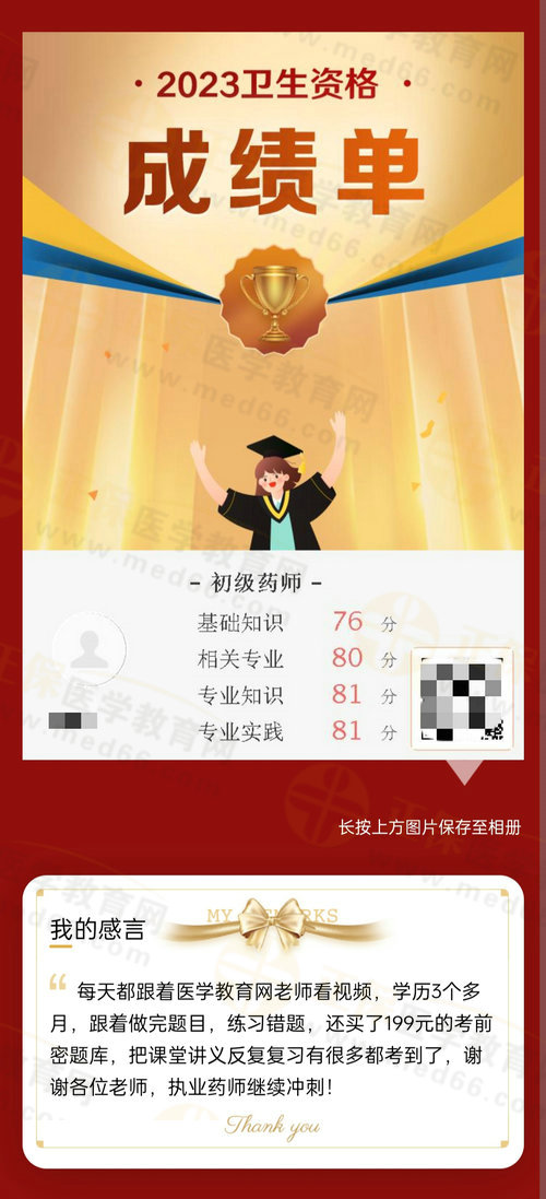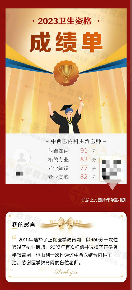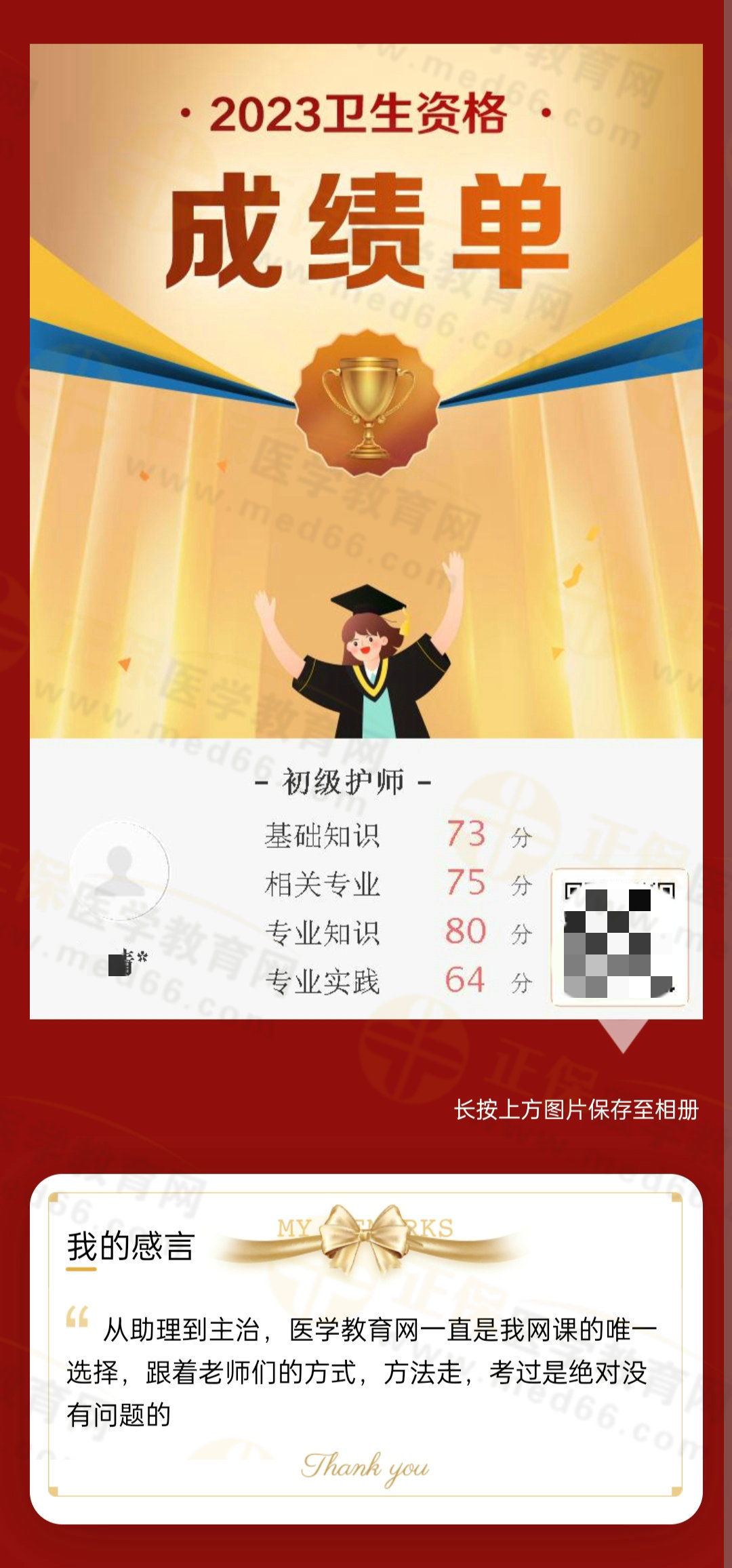 努力付出終有收獲!恭喜這位學(xué)員,順利通過考試!也感謝大家對(duì)網(wǎng)校、對(duì)老師的認(rèn)可!小編也想對(duì)正在準(zhǔn)備參加2024年衛(wèi)生資格考試的考生說,希望通過這位學(xué)員的分享可以讓大家更加信賴醫(yī)學(xué)教育網(wǎng)的老師,相信醫(yī)學(xué)教育網(wǎng)課程的品質(zhì)!