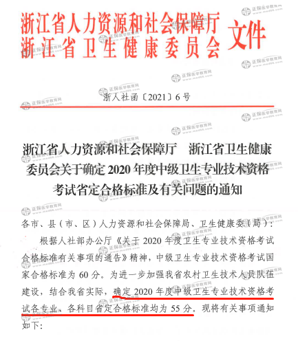 為進(jìn)一步加強(qiáng)浙江省農(nóng)村衛(wèi)生技術(shù)人員隊(duì)伍建設(shè),結(jié)合浙江省實(shí)際,確定2020年度中級(jí)衛(wèi)生專業(yè)技術(shù)資格考試各專業(yè)、各科目省定合格標(biāo)準(zhǔn)為55分。