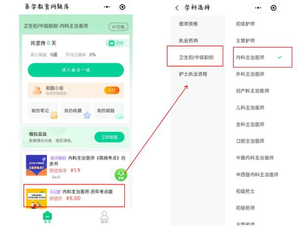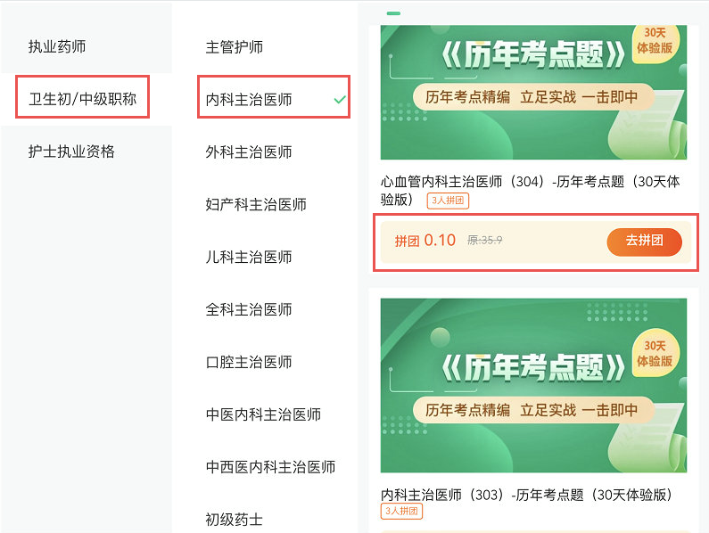 2、點(diǎn)擊“切換”-“衛(wèi)生初/中級職稱”,選擇報(bào)考類別,進(jìn)入類別頁面下滑到底部選擇“歷年考點(diǎn)題”,3人團(tuán),到手價(jià)僅需0.1元!
