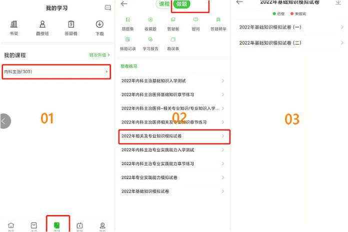 (1)登錄醫(yī)學(xué)教育網(wǎng)APP,點(diǎn)擊底部導(dǎo)航“學(xué)習(xí)”按鈕,選擇相應(yīng)課程(如內(nèi)科主治醫(yī)師課程)。