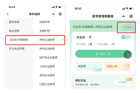 2.選擇“衛(wèi)生初/中級職稱”類別,您參加的考試專業(yè),如內(nèi)科主治醫(yī)師。(下滑有更多專業(yè)哦~)。如需切換考試專業(yè)可點(diǎn)擊右上角進(jìn)行切換。