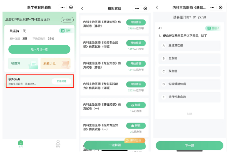 每個(gè)科目提供1套免費(fèi)仿真模擬實(shí)戰(zhàn)試卷,模擬真實(shí)考試時(shí)間、題量及難度,測試考生復(fù)習(xí)成果以及應(yīng)試水平。點(diǎn)擊“解鎖”或者“一鍵解鎖”,完成解鎖,每個(gè)科目還可以多做2套實(shí)戰(zhàn)模擬卷哦~