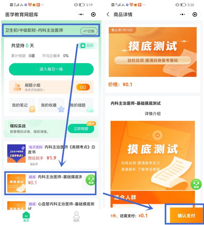 二、選擇相應(yīng)考試,如“內(nèi)科主治醫(yī)師”。點(diǎn)擊【內(nèi)科主治醫(yī)師-基礎(chǔ)摸底測(cè)試】,支付0.1元后即可參與測(cè)試。其他考試專業(yè)可點(diǎn)擊右上角“切換”按鈕進(jìn)行切換。