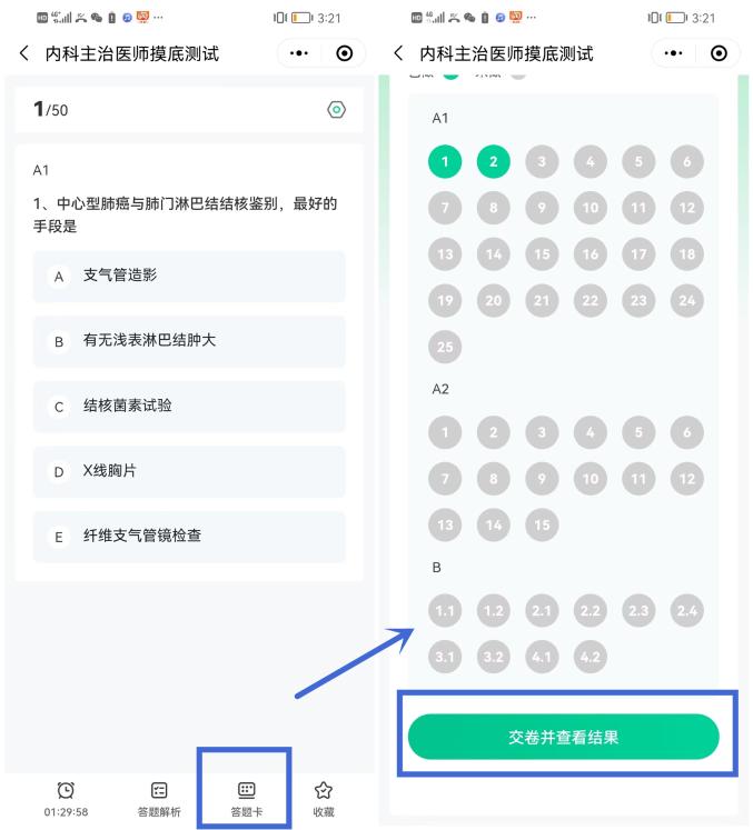 四、完成測(cè)試后,可點(diǎn)擊屏幕下方“答題卡”進(jìn)行“交卷并查看結(jié)果”。