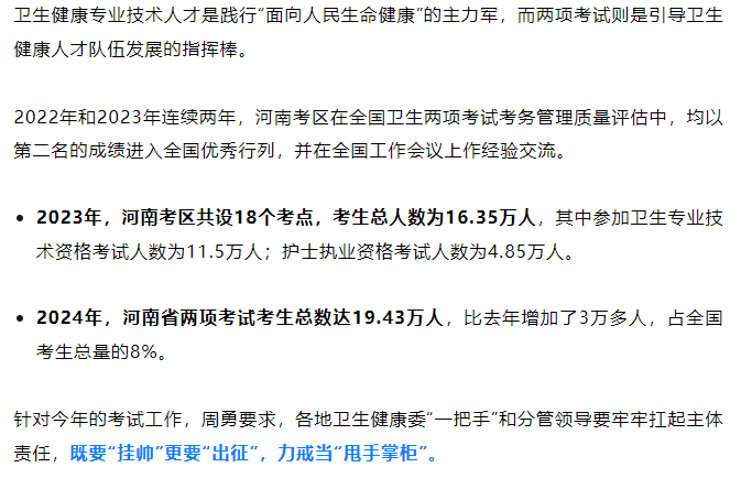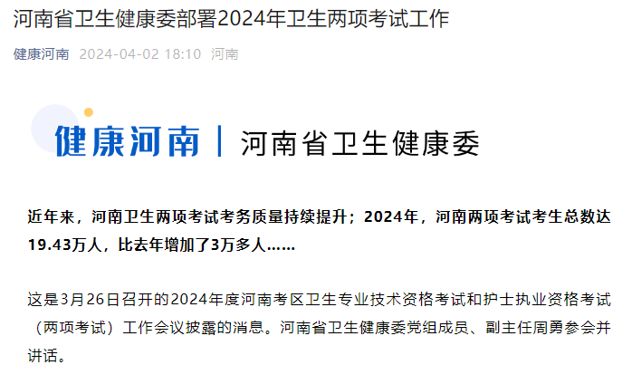 近日“健康河南”官方公眾號(hào)發(fā)布了“河南省衛(wèi)生健康委部署2024年衛(wèi)生兩項(xiàng)考試工作”的文章,該文章中指出:2024年,河南省兩項(xiàng)考試考生總數(shù)達(dá)19.43萬(wàn)人,占全國(guó)考生總量的8%!