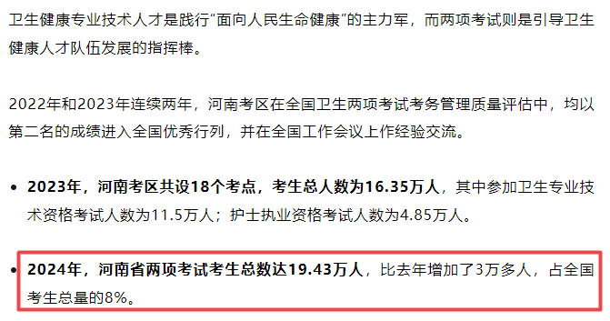 2024年衛(wèi)生資格考試已結(jié)束,由河南官方通知可知,河南省2024年衛(wèi)生資格及護(hù)士資格考試考生總數(shù)達(dá)19.43萬(wàn)人,占全國(guó)考生總量的8%。可見(jiàn)全國(guó)兩項(xiàng)考試的考生數(shù)量可達(dá)204萬(wàn)余人!