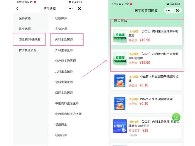 2.選擇相應(yīng)輔導(dǎo)(如內(nèi)科主治醫(yī)師),滑動(dòng)到頁面下方“熱賣商品”區(qū)域,參與拼團(tuán)即可。