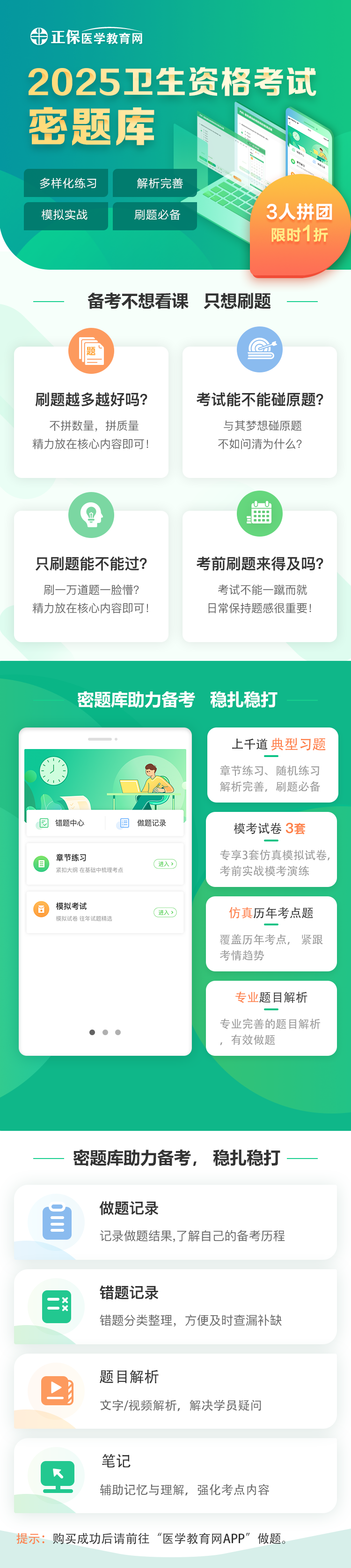 各位2025年衛(wèi)生資格考生注意啦!醫(yī)學(xué)教育網(wǎng)送福利啦!《密題庫》原價(jià)199元,現(xiàn)在3人拼團(tuán)1折,僅需19.9元,快去搶購吧~