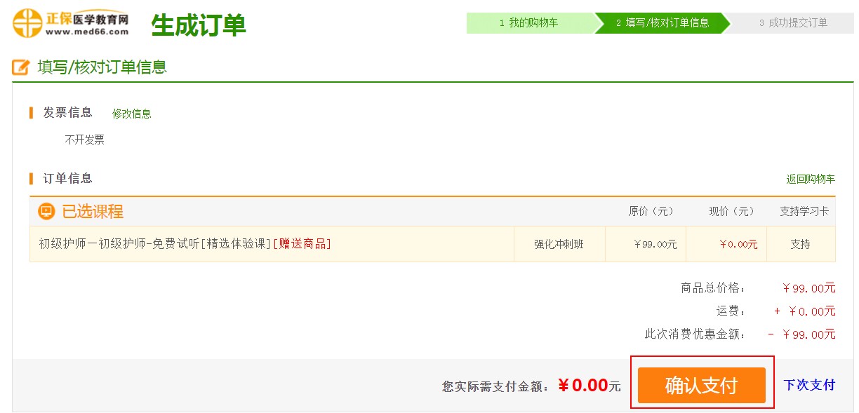 第二步:提交訂單,確認(rèn)支付“0元”;